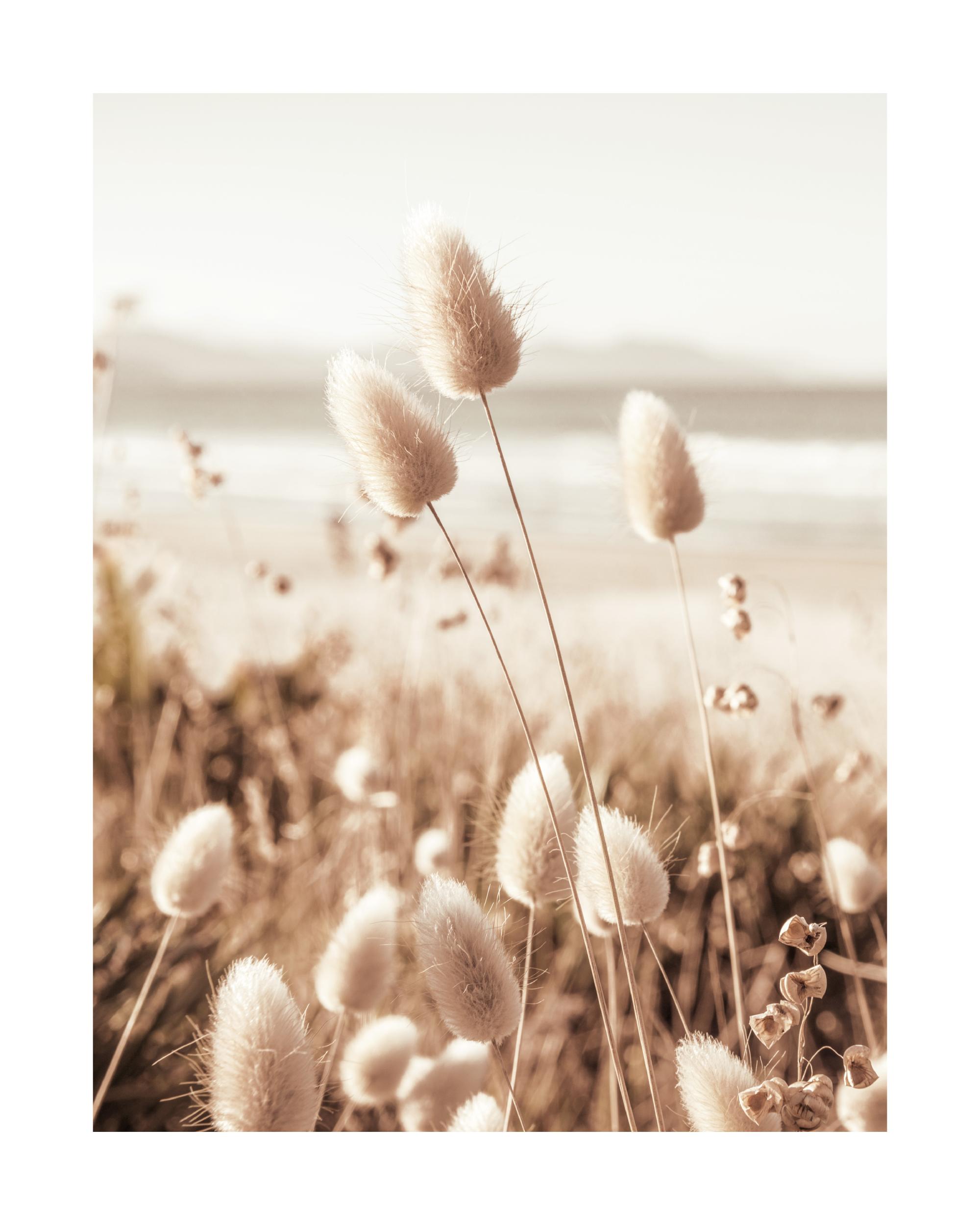 En billedvæg med kunst i varme farver som fersken og orange. Kunsten skaber en hyggelig stemning med bløde nuancer og naturlige toner.