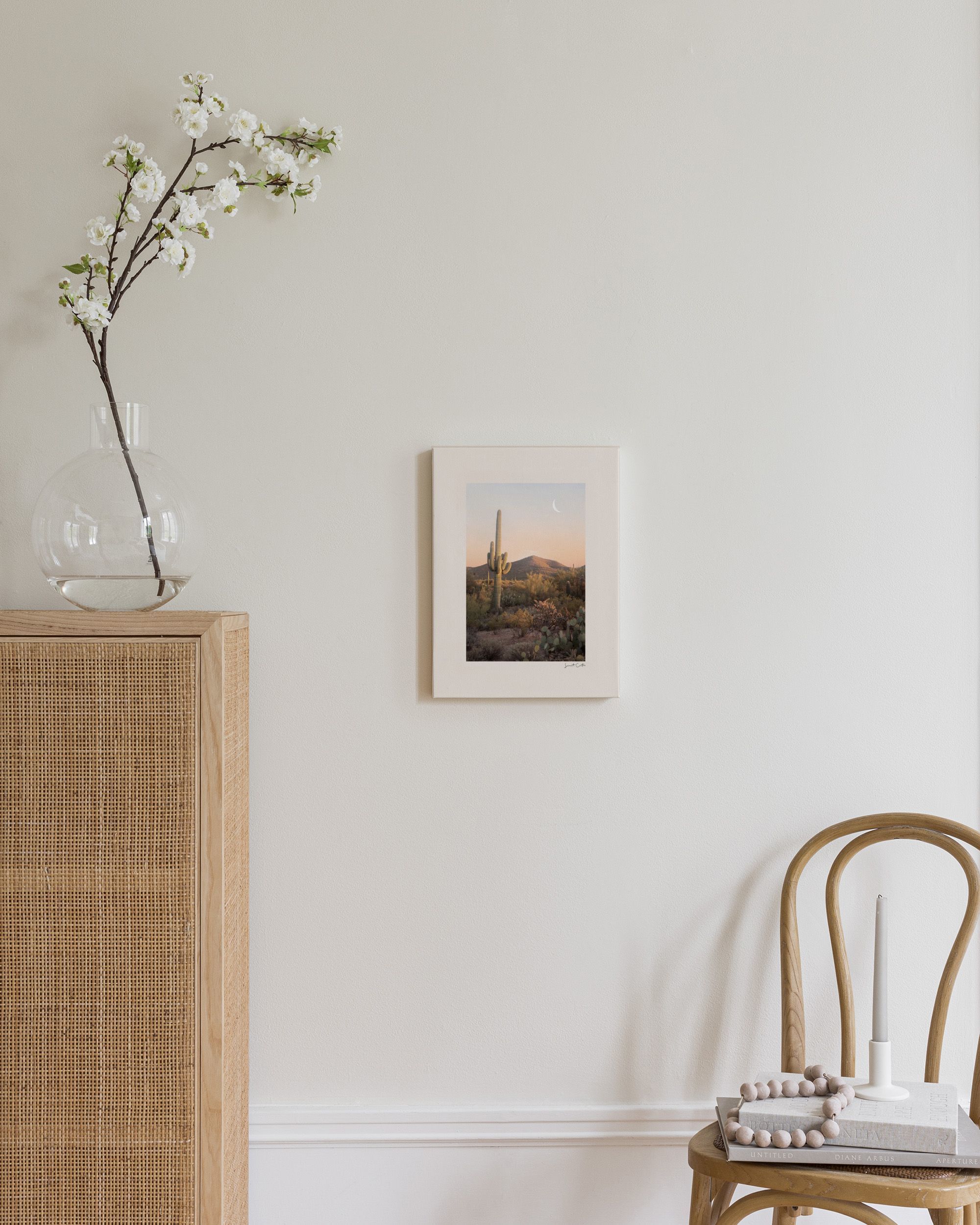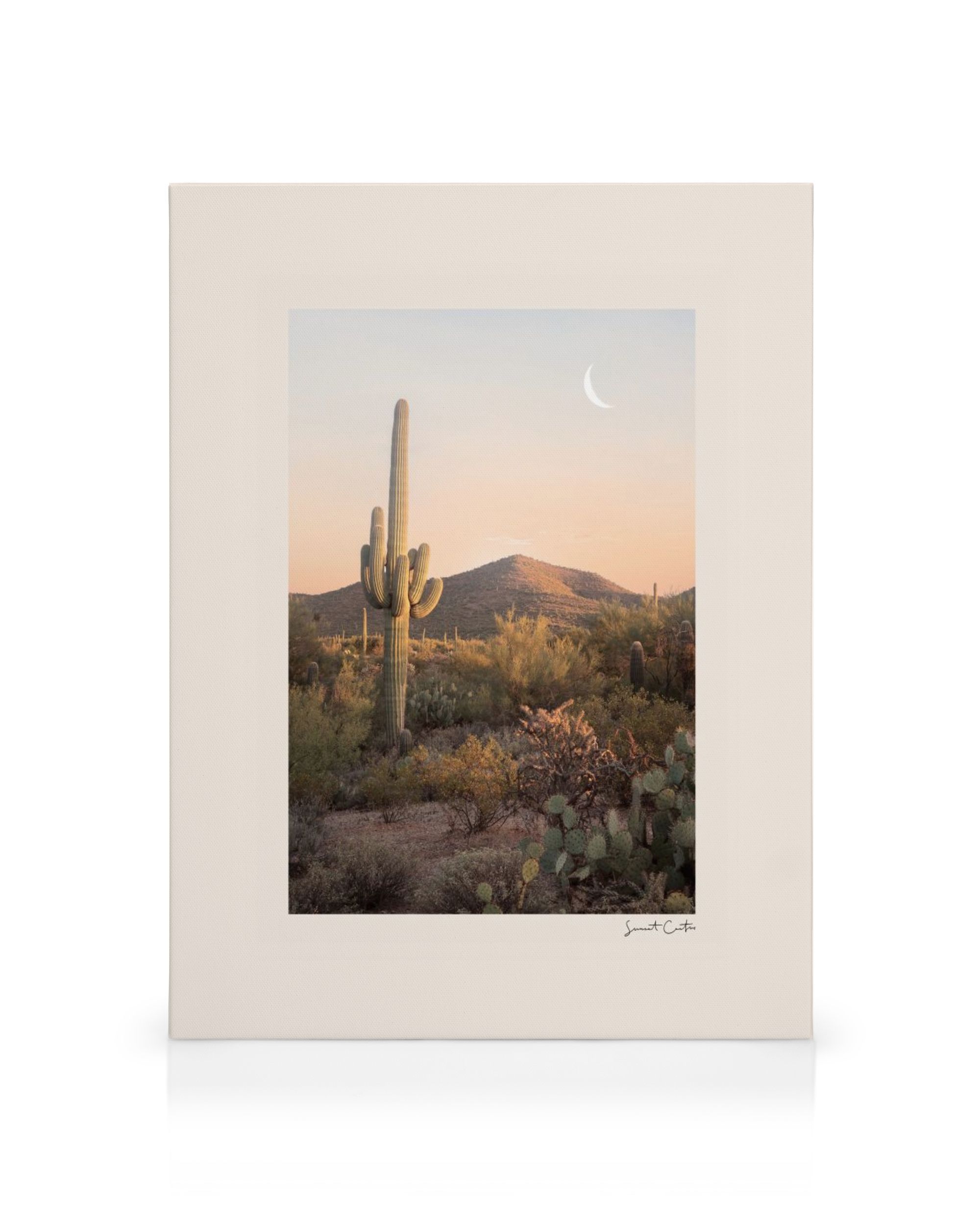 Et lærred med en kaktus i et øde landskab. Solnedgangens orange og lyserøde farver giver billedet en rolig stemning.