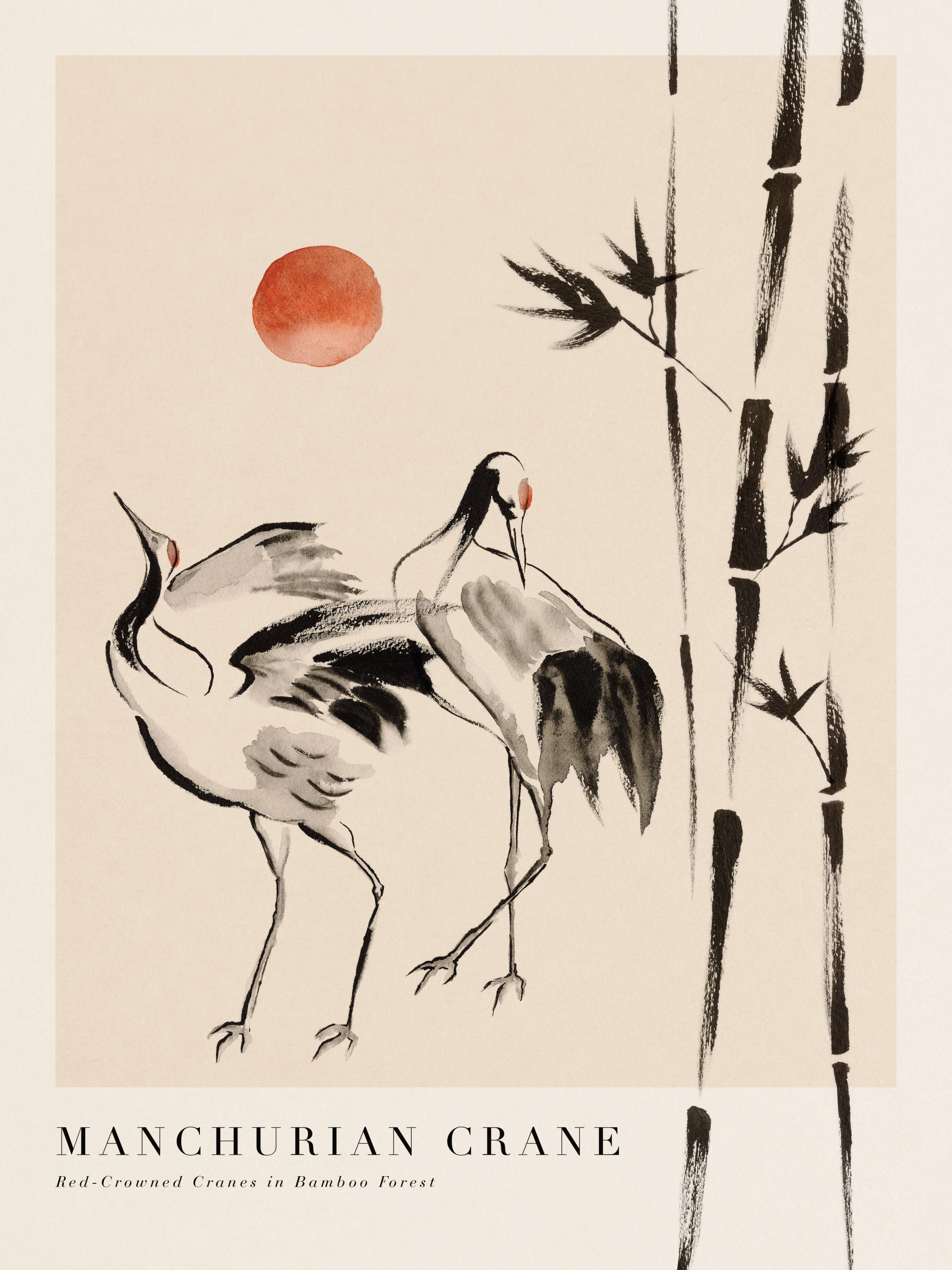 Fra 116,20 kr.Kunsttryk i beige af to traner og en orange sol ved siden af bambustræer med teksten "Manchurian Crane Red-crowned Cranes in Bamboo Forest" Dette kunsttryk har en kant i en lysere beige farve for at indramme motivet.