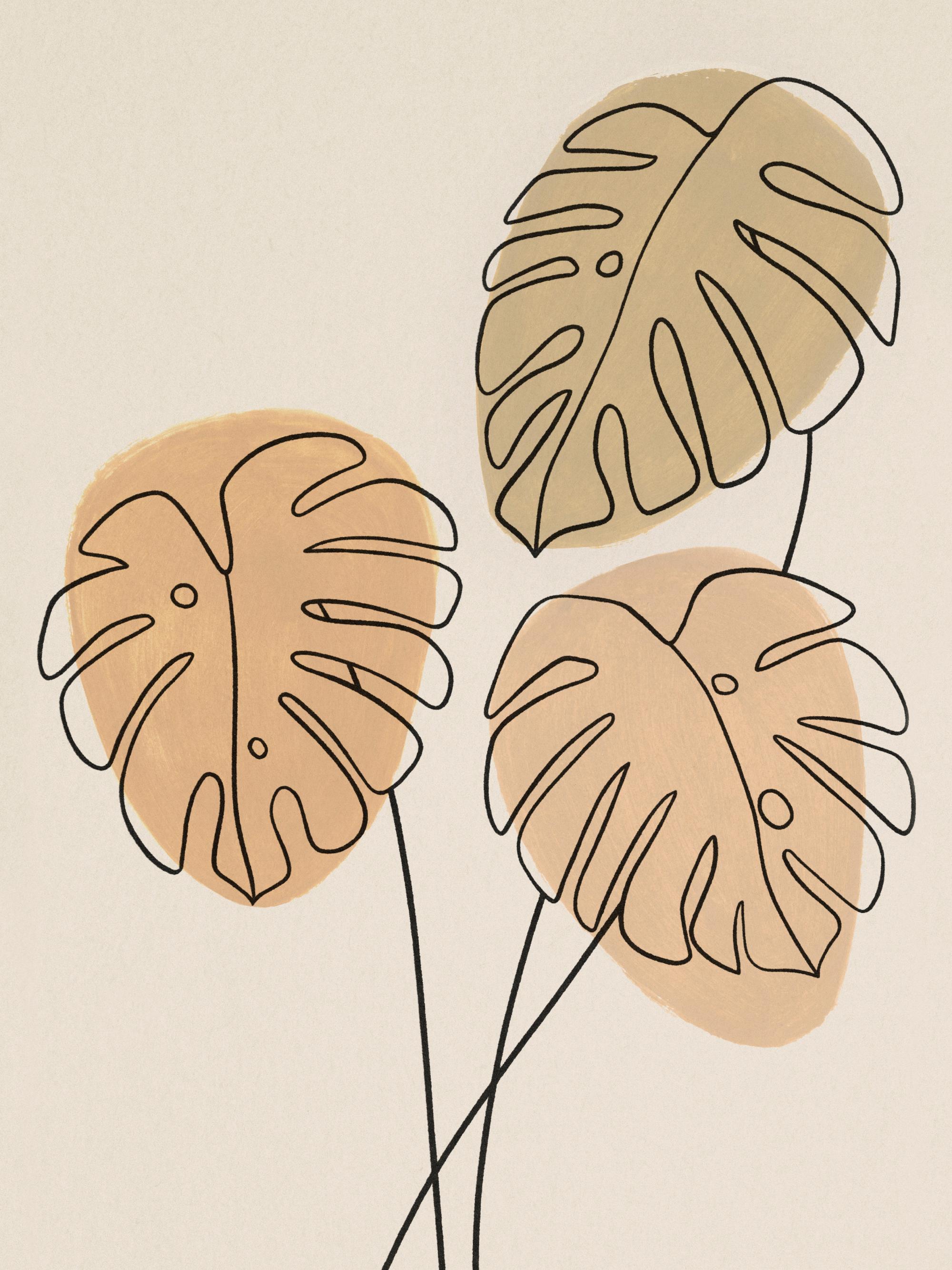Fra 97 kr.En smuk Illustration med tre monsterablade tegnet i sort line art-stil på en beige baggrund. Hvert monsterablad har en abstrakt cirkel, der er malet i forskellige brune nuancer. Det kan aldrig gå galt med den trendy plante monstera! Denne kunstplakat vil sætte et helt specielt og charmerende præg på stuen.
