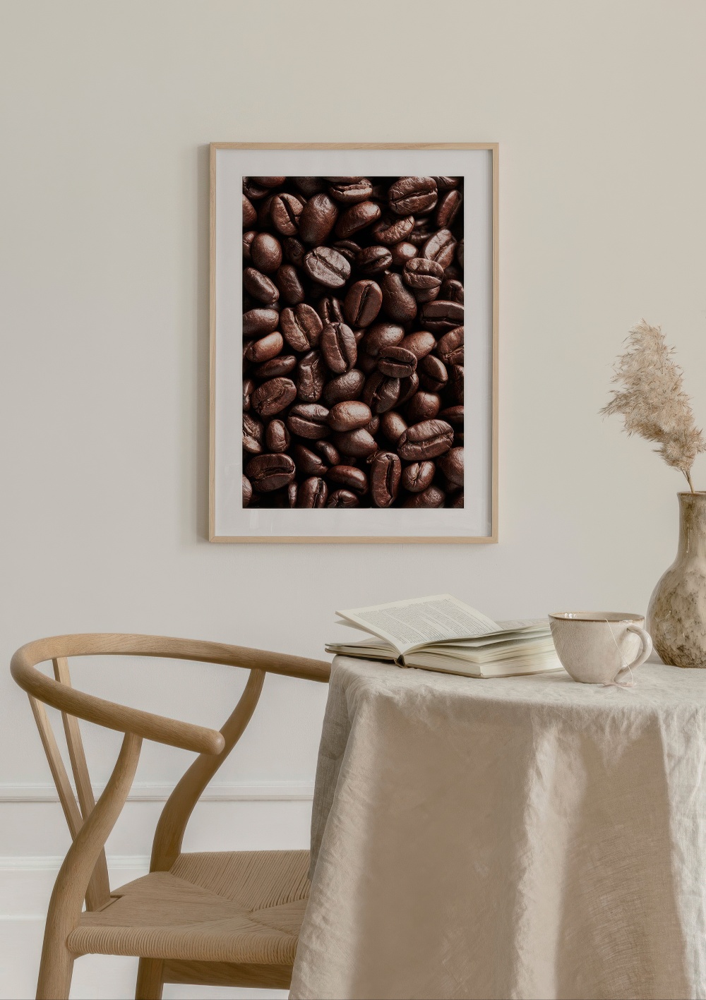 Foto af kaffebønner i nærbillede. Den perfekte køkkenplakat til kaffeelskeren! Kombiner dette print med andre kaffetryk og citater.