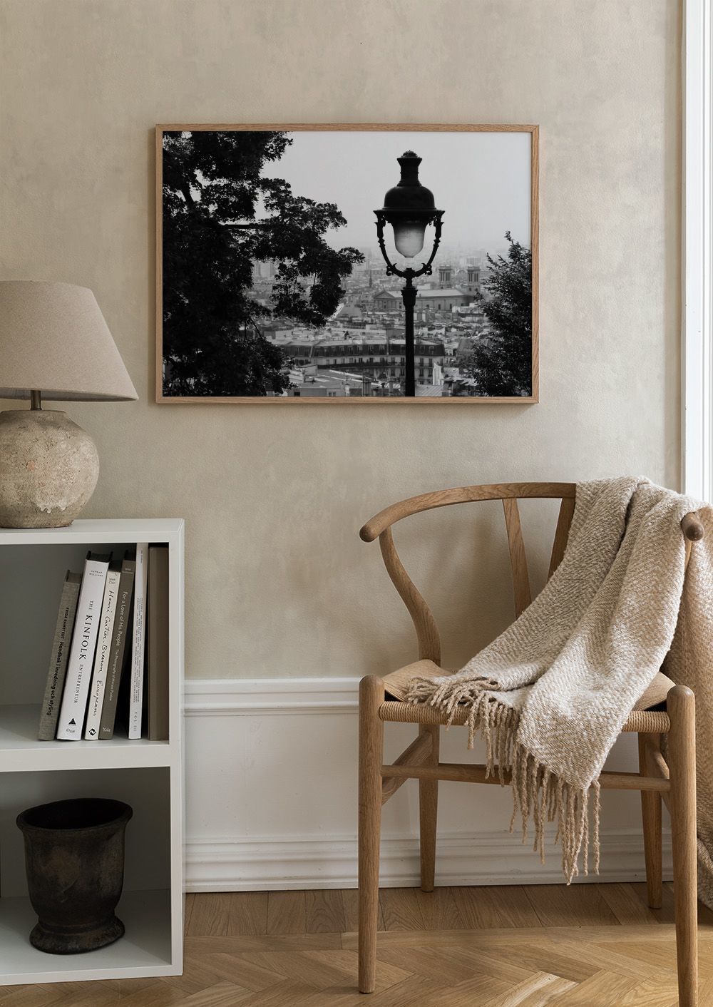 En smuk plakat med en gammel gadelampe i sort og hvid. I baggrunden ses en by med mange bygninger. Perfekt plakat til dit hjem.